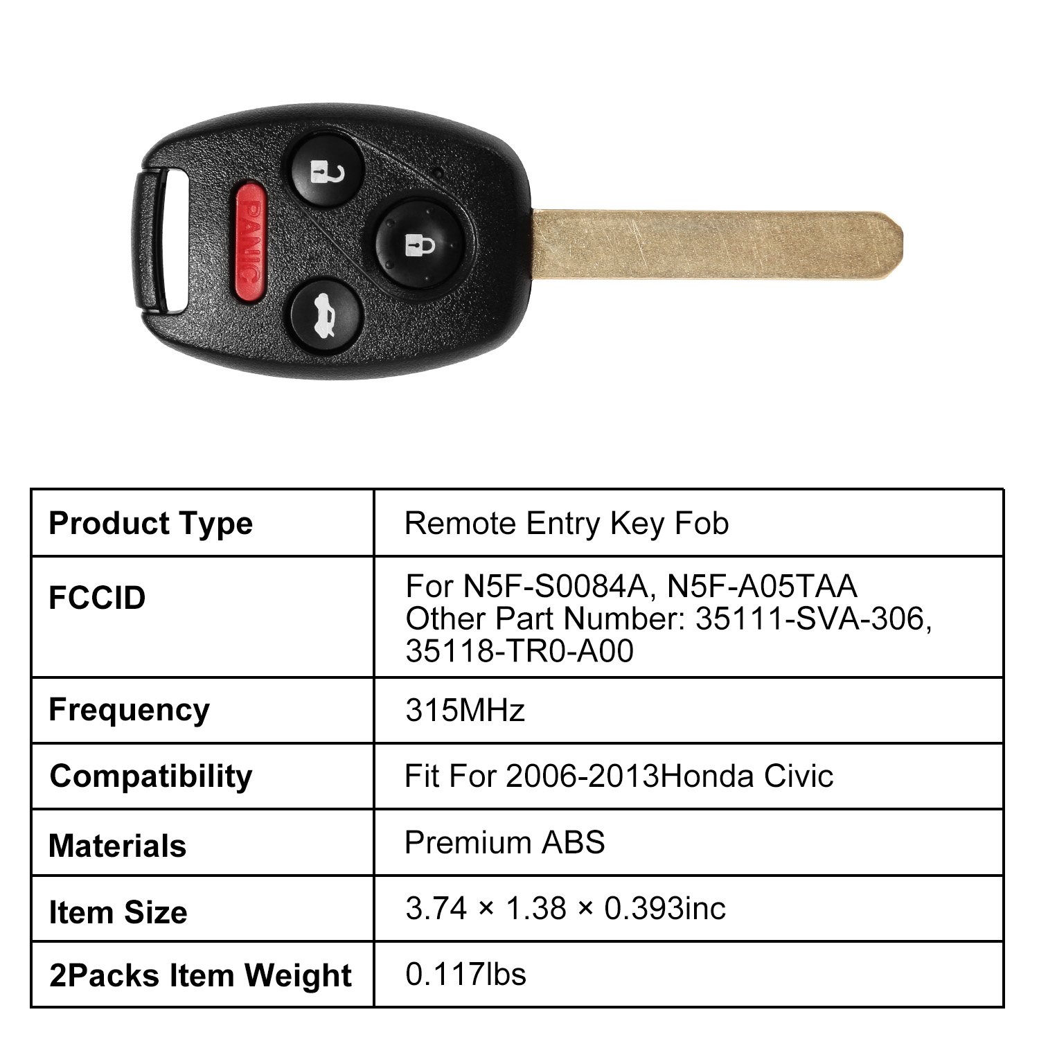 - *WIDE COMPATIBILITY: Featured with FCC ID: N5F-S0084A, N5F-A05TAA; other part number: 35111-SVA-306, 35118-TR0-A00. Widely fit for Honda Civic 2006-2013 (Reference Only).